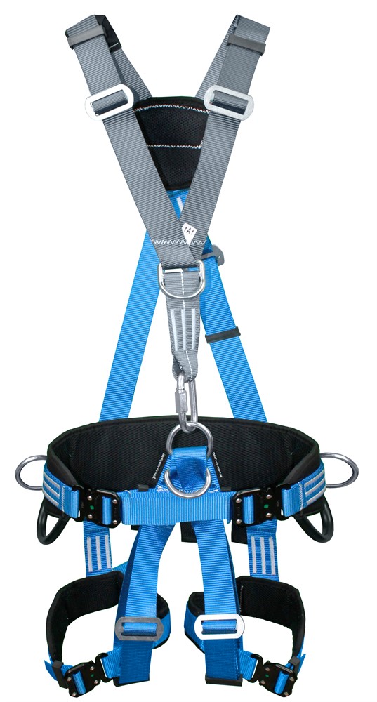 Страховочная привязь парашютного типа с наплечными и набедренными лямками которые регулируется самофиксирующимися пряжками, двумя элементами крепления стропа для страховки(на груди и спине) и тремя - для удержания и позиционирования(на поясе).