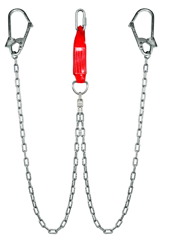 Строп аГд К50+Кс - страховочный строп, двойной (двуплечий) из металлической цепи с амортизатором, двумя большими монтажными и одним соединительным карабином