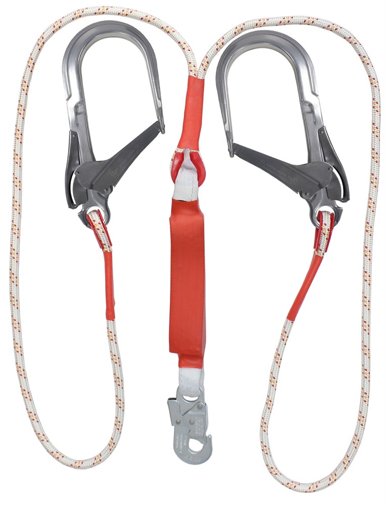 Строп аВд К110+К20 NL (канат в оплетке) - страховочный двойной (двуплечий) строп из капроновой верёвки с амортизатором, двумя большими монтажными карабинами и одним малыми монтажными карабинами.