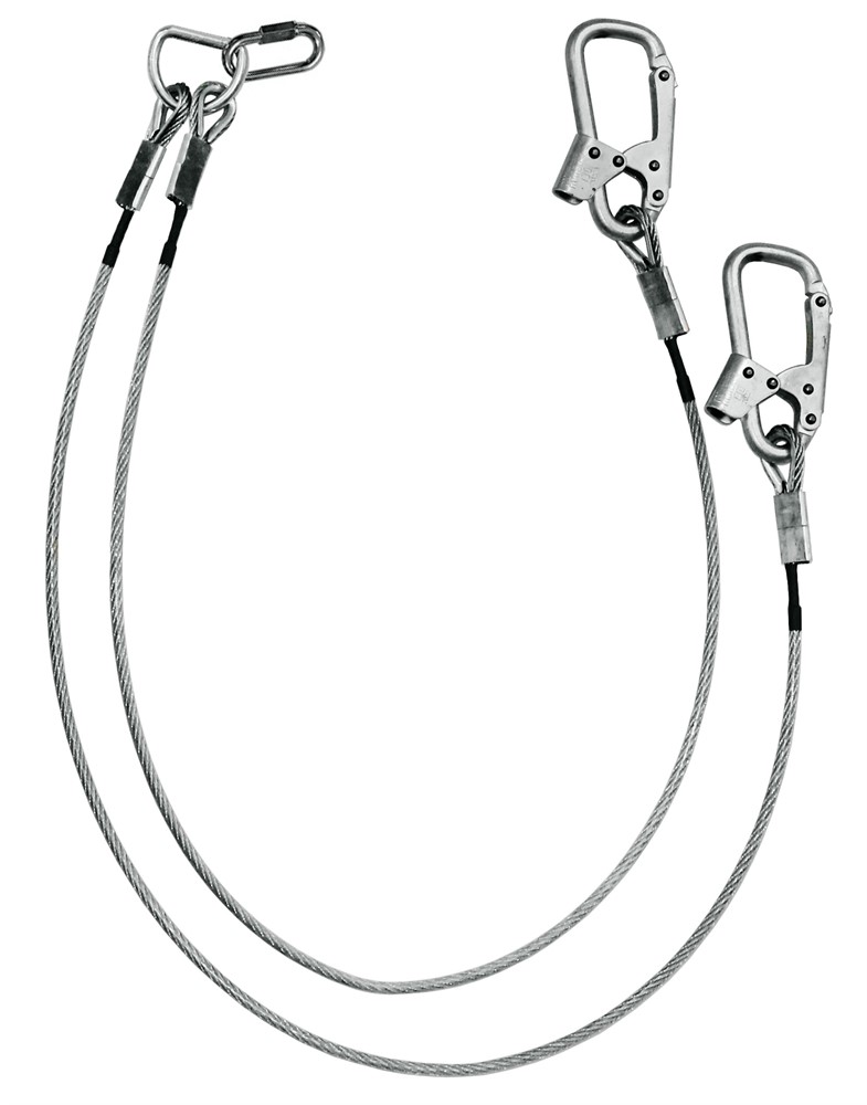 Строп Бд+Кс - строп, двойной (двуплечий) из металлического троса в ПВХ оболочке с двумя большими монтажными и одним соединительным карабином