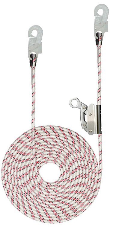 Зажим на гибкой анкерной линии ползункового типа (не разёмное страховочное устройство ползункового типа, оснащенное автоматическим замыкающим механизмом. Материал – сталь с гальванопокрытием. Используется с канатом с сердечником низкого растяжения диаметром 12 мм., концы стропа зашиты пластиковые коуши). Комплектуется двумя карабинами К20 NL раскрытие зёва карабина 18мм. и блокирующим устройством ползункого типа.