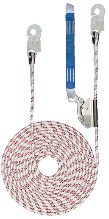 Зажим на гибкой анкерной линии ползункового типа (не разёмное страховочное устройство ползункового типа, оснащенное автоматическим замыкающим механизмом. Материал – сталь с гальванопокрытием. Используется с канатом с сердечником низкого растяжения диаметром 12 мм., концы стропа зашиты пластиковые коуши). Комплектуется блокирующим устройством ползункого типа со стрпом А (0,5 метра).