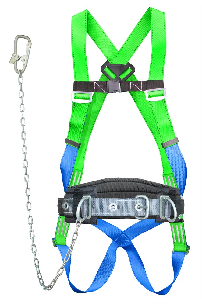Пояс состоит из ремня с пряжкой, уширенного (широкого) кушака, наплечных и набедренных лямок, двух D-колец на поясе и одного на спине (для страховки или спасательных работ и экстренной эвакуации) и стропа - металлическая цепь с монтажным карабином. Пояс упакован в водонепроницаемый пакет и содержит паспорт и инструкцию по применению.