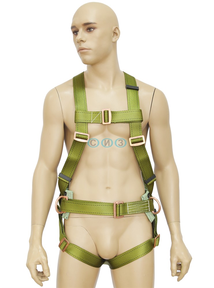Состоит из наплечных и набедренных лямок, ремня с пряжкой, кушака, двух D-колец для удержания и позиционирования, заднего D-кольца (элемента крепления) на спине и переднего элемента крепления (двух петель) для спасательных работ, экстренной эвакуации, страховки поднятия и опускания из замкнутых пространств. Все стальные детали имеют гальванопокрытие "меднение". Лента антистатичная. Кушак из брезента. Привязь упакована в водонепроницаемый пакет и содержит паспорт и инструкцию по применению.