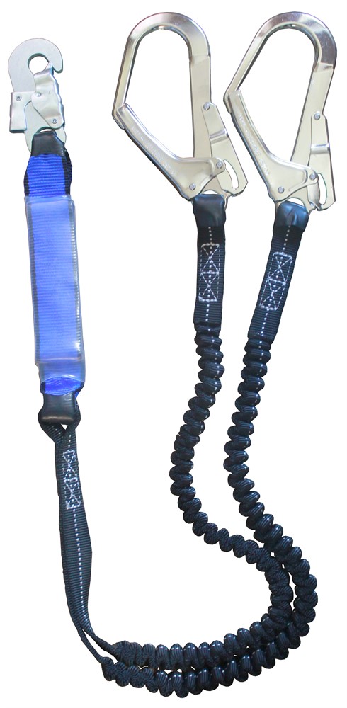Строп аАд К50+К20 NL эластичный страховочный строп, двойной (двуплечий) из полиэфирной ленты с амортизатором, двумя большими монтажными и одним соединительным карабином