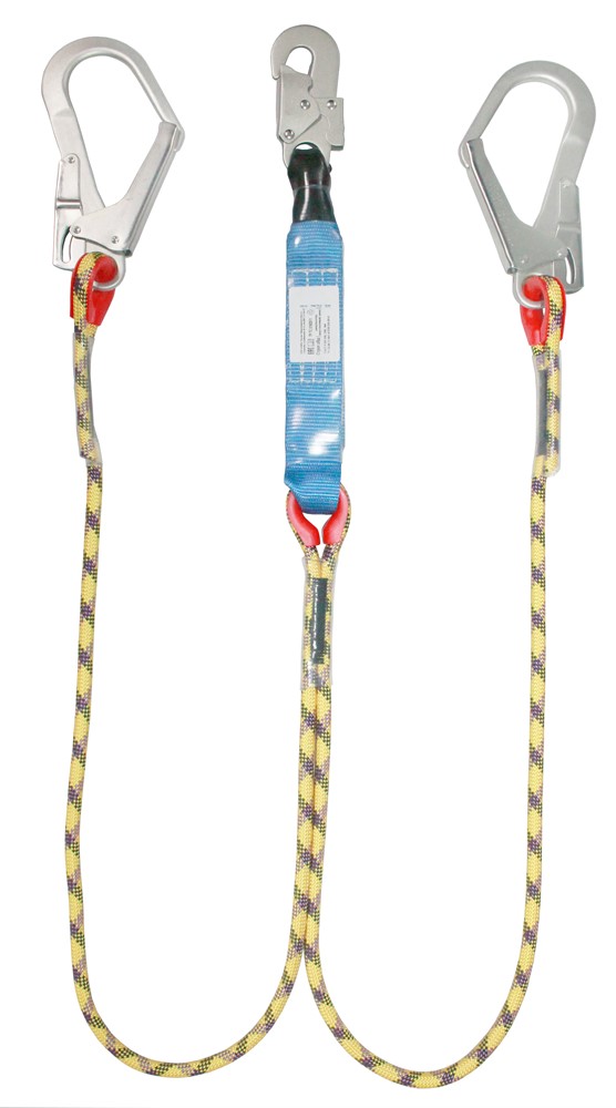 Строп аВд К50+К20 NL (канат в оплетке) - страховочный двойной (двуплечий) строп из капроновой верёвки с амортизатором, двумя большими монтажными карабинами и одним малыми монтажными карабинами.