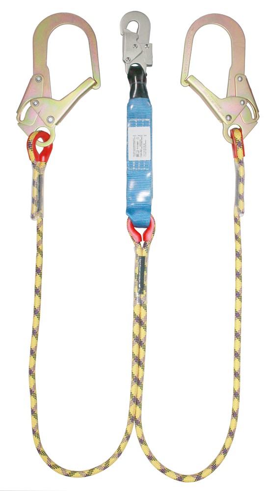 Строп аВд К50+К20 NL (канат в оплетке) - страховочный двойной (двуплечий) строп из капроновой верёвки с амортизатором, двумя большими монтажными карабинами и одним малыми монтажными карабинами.