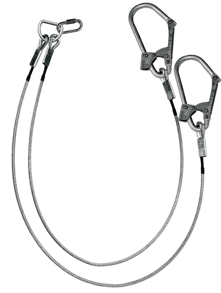 Строп Бд К50+Кс - строп, двойной (двуплечий) из металлического троса в ПВХ оболочке с двумя большими монтажными и одним соединительным карабином