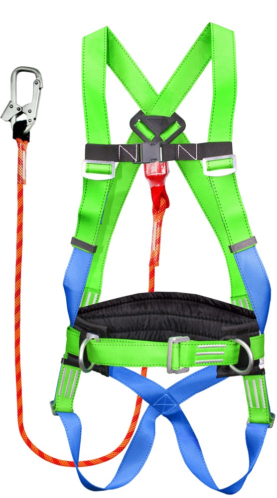 Состоит из привязи ремня с пряжкой, наплечных и набедренных лямок, уширенного кушака, двух D-колец на поясе (для удержания и позиционирования) и одного на спине и страховочного стропа из полиамидного каната с амортизатором. Привязь упакована в водонепроницаемый пакет и содержит паспорт и инструкцию по применению.